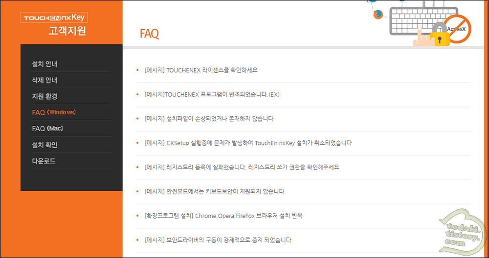 라온시큐어에서 제작, 배포하고 있는 키보드 보안 프로그램 TouchEn nxkey(이하 TouchEn)이 설치가 되지 않는 경우가 종종 있습니다.